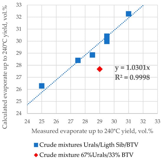 Figure 3 shows a plot of the correlation between the calculated ASTM D 86 boiling fraction volumetric yield up to 240 °C, using the linear mixing rule for the seven mixing tank samples and the measured values reported in Table S2. All three component petroleum mixtures which contain Light Siberian crude oil exhibit the validity of the linear blending rule, while those not containing Light Siberian crude oil indicate a deviation from this rule. The data to calculate the ASTM D 86 boiling fraction volumetric yield up to 240 °C were used from Table S2 (the composition of petroleum blend) and from Table S5 (ASTM D 86 distillation data of crude oils Urals, Light Siberian, and BTV). The data presented in Figure 3 are in line with the results reported in [44,45,46] showing that the crude oil blend distillation characteristics may not be additive for some oil mixtures. In this case, the crude mixture 67% Urals/33% BTV obviously does not follow the linear blending additive rule.
