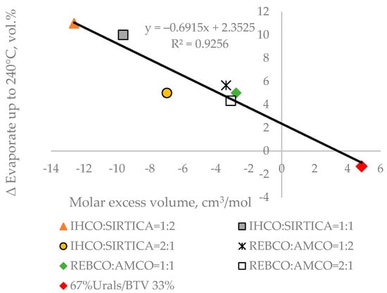 In our recent study [44], where 12 crude oil blends were investigated using TBP distillation apparatus, it was shown that for the petroleum blends which deviate from the linear blending rule, the molar excess volume correlates with the difference between the measured TBP yield and the calculated one using the linear blending rule. Having in mind that the TBP fraction yields correlate with ASTM D 86 distillation yields (Equations (S1)–(S6)), we decided to test the validity of the relation established in [44] between the molar excess volume and the difference between measured and calculated ASTM D 86 boiling fraction volumetric yield up to 240 °C following the linear blending rule. For that purpose, ASTM D-86 distillation characteristics of four crude oils investigated in [44], namely Iranian Heavy (IHCO), Sirtica, Russian Export Crude blend (REBCO), and Arabian medium (AMCO) (shown in Table S6), were used to calculate the ASTM D 86 boiling fraction volumetric yields up to 240 °C following the linear blending rule of their blends: IHCO:SIRTICA = 1:2; IHCO:SIRTICA = 1:1; IHCO:SIRTICA = 2:1; REBCO:AMCO = 1:2; REBCO:AMCO = 1:1; and REBCO:AMCO = 2:1. The measured ASTM D 86 distillation characteristics of the six crude blends aforementioned are presented in Table S7. Then, the molar excessive volume of these blends calculated using the procedure described in [44] were plotted against the difference between measured and estimated ASTM D 86 boiling fraction volumetric yields up to 240 °C. Figure 4 shows the presence of a good correlation between the molar excess volume and ∆ ASTM D 86 boiling fraction volumetric yields up to 240 °C.