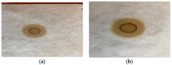 Table 3 summarizes data of oil colloidal stability test results. The CPC crude oil Sp critical was not possible to determine using the n-heptane dilution test when centrifugation was used as described by Nemana et al. [36] because no asphaltene precipitation was registered. However, by using the spot technique as described in [47,48,49], the CPC crude oil can be classified as self-incompatible. Figure 5 indicates photographs of the spot test obtained by performing a toluene equivalence test and heptane dilution test as described by Wiehe in [50,51]. It is seen from Figure 5a that the addition of 10 mL toluen to a 2 mL CPC crude oil sample (toluene equivalence test) does not lead to dissolution of asphaltenes, yielding a dark ring about the centre of the yellow–brown spot. Figure 5b shows that the addition of 10 mL heptane to a 2 mL CPC crude oil sample (heptane dilution test) does not provide a much different picture than that of the toluene equivalence test.