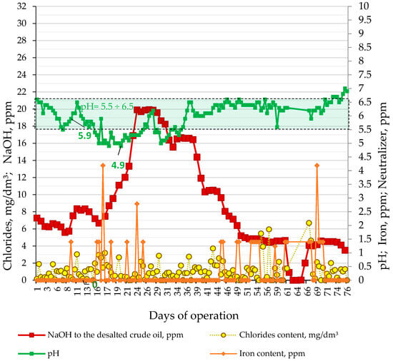 Variation of pH, NaOH treating rate, iron, and chloride contents in sour water in the LNB refinery CDU-2 during processing of the nine crude oils and the imported atmospheric residue for 76 days.