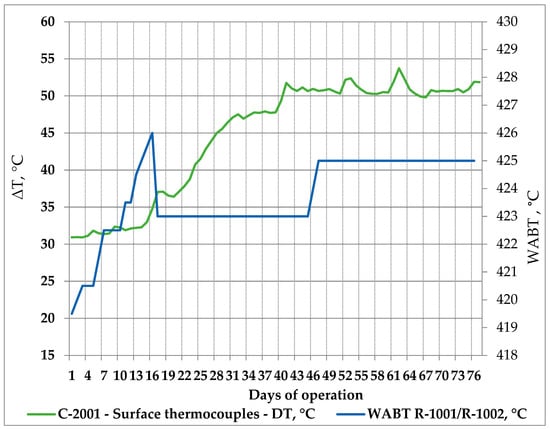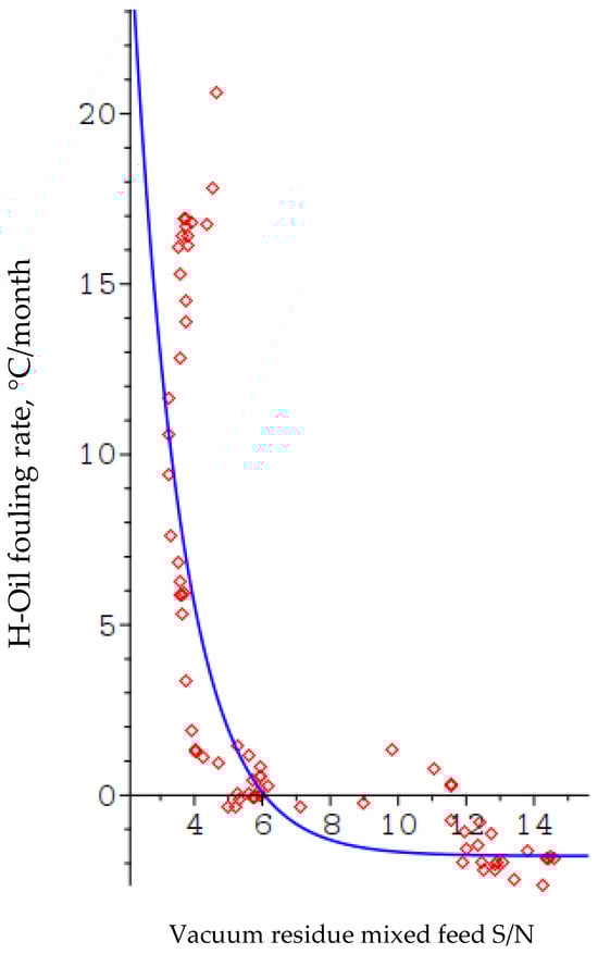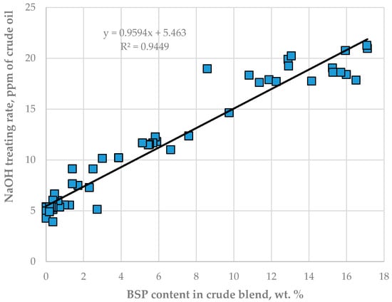 The data in Table 14 include calculated Na content in the mixed vacuum residue fractions that were measured in vacuum residue sampled from the crude distillation unit. The minimum Na content values that were calculated and measured are very close. However, the maximum content of Na in the measured mixed vacuum residue fraction is higher by 16 ppm, obviously reflecting the increased rate of NaOH addition in CDU when higher-acidity crude oil blends were processed. The latter will be discussed later in this work. Our earlier study has shown that with each 1 ppm of NaOH added to the crude oil in CDU, the vacuum residue sodium content increases by 2.4 ppm [53].