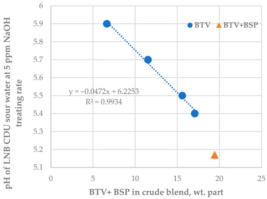 The data in Tables S13 and S14 indicate that the caustic treatment rate has positive statistically meaningful consonance with both crude oils BSP (μ = 0.87; υ = 0.08) and BTV (μ = 0.75; υ = 0.21) with a stronger effect of BSP over BTV. The data in Figure 7 also confirm the strong relation of NaOH treatment rate with the content of crude oils BSP in the processed crude oil mixture. The caustic treatment rate was increased to neutralize the increased acidity of sour water during processing blends containing a higher share of the crude oils BTV and BSP (see Figure 8).