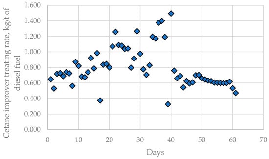 Variation of density, sulphur, cetane index, and aromatic content of mixed kerosene fractions for the studied period of 76 days.