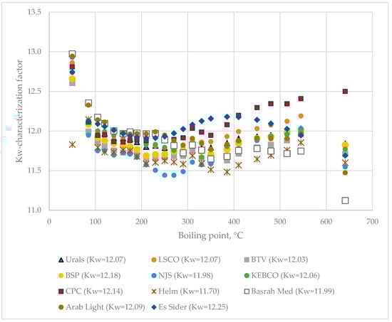 The TBP analysis provides the most comprehensive information about petroleum fraction yields, density, and sulphur content. This data set can be used to estimate with empirical methods a great number of fraction characteristics like content of paraffinic, naphthenic, and aromatic carbons, refractive index, molecular weight, cetane index, etc. [43]. Unfortunately, it takes three working days to perform. The ASTM D 86 distillation test needs less than two hours to implement. This makes it convenient for quick evaluation of the distillation characteristics of a petroleum. The data in Table 1 were used to develop regression equations, which allow for the prediction of TBP distillation yields from ASTM D 86 data of yields of fraction boiling up to 200 and 300 °C. These equations are summarized in the Supplementary Materials.