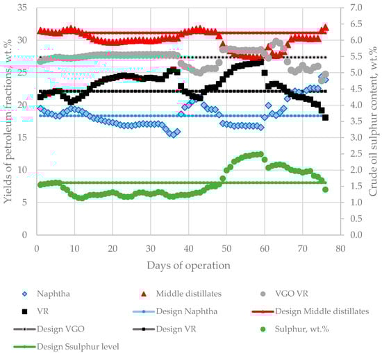 - Stratiev, D.; Shishkova, I.; Dinkov, R.; Sotirov, S.; Sotirova, E.; Atanassov, K.; Ribagin, S.; Nikolova, R.; Veli, A.; Palichev, G.; et al. Do the True Boiling-Point Distillation Yields of Crude Oil Blends Obey the Additive Blending Rule? Processes 2023, 11, 1879. [Google Scholar] [CrossRef]