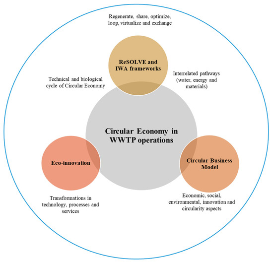 In addition to CE, EI strategies can also be applied in WWTPs, focusing on innovations that allow changes in processes, equipment, services or methods, to reduce negative impacts on the environment. It was determined that there are intersecting elements between CE, the ReSOLVE framework, the Water Utilities Pathways of IWA framework and EI; these approaches aim to reduce the negative externalities of production and consumption processes in order to provide options that allow for balancing the economic, social, political and environmental aspects, which are the engine of sustainability.