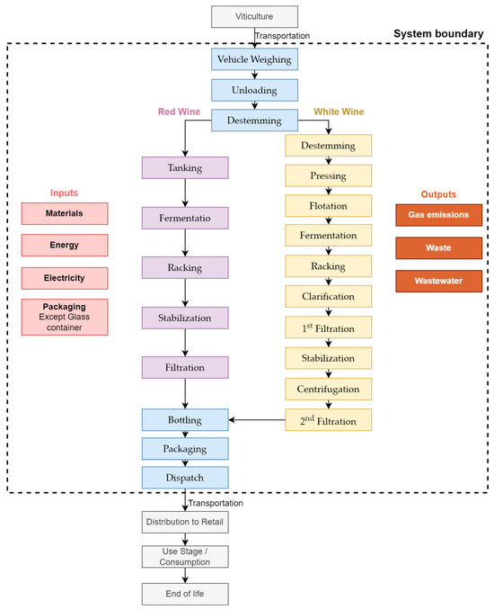 Our research specifically addresses the noticeable gap in LCA studies within Brazil’s wine industry, with a focus on identifying critical environmental hotspots and significant flows throughout the wine production process. Despite the availability of numerous studies on wine production globally [12,25,26,27], research detailing the vinification stage remains sparse, often treating it as a monolithic process without distinguishing between its constituent steps [28].