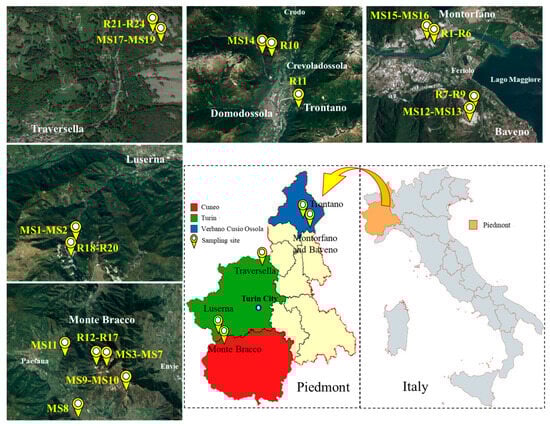 Northwestern Italy, and the Piedmont Region in particular, is characterized by a wide presence of dimension stones (igneous, metamorphic, and sedimentary). Different EWs in four quarrying areas (Figure 1), linked to specific dimension stones, were investigated. A brief description of the four quarrying sites (Luserna Stone quarry basin, the VCO quarrying area [,], the Traversella quarry area [,], and the Monte Bracco quarrying and mining area [,]) follows.