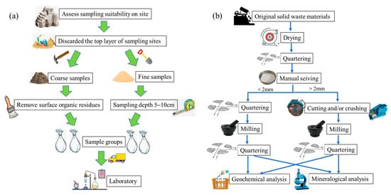 Laboratory activities included the drying, sieving, quartering [], grinding, and testing of all samples. For each sampling site, a representative sample was stored for backup []. The preparation process of samples and sub-samples in the laboratory is shown in Figure 2b.