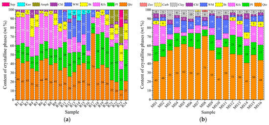 Main minerals present in soil and EW samples: (a) EWl; (b) soil. Qtz = quartz; Pl = plagioclase; Kfs = K-feldspar; Bt = biotite; WM = white mica (muscovite)—illite; Chl = chlorite; Amph = amphibole (mainly hornblende); Clay = illite, kaolinite, mixed clays; Carb = carbonates (calcite); Zeo = zeolites; Kao = kaolinite; Sep = sepiolite; Amph = amphibole (mainly hornblende). Some mineral contents are lower than limit of detection and are ignored here.