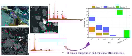 PLM micrograph (A) and SEM back-scattered electrons images with EDS spectrum of EW (B,C): (A) allanite (Aln) crystal of a Serizzo Antigorio gneiss sample, PLM micrograph, and crossed polars; (B) SEM back-scattered electrons image of a monazite-Ce (Mnz) crystal of a Baveno granite sample; (C) SEM back-scattered electrons image of a Xenotime-Y (Xtm) crystal of a kaolinitic sand sample from Monte Bracco.