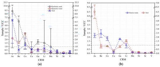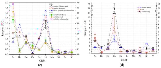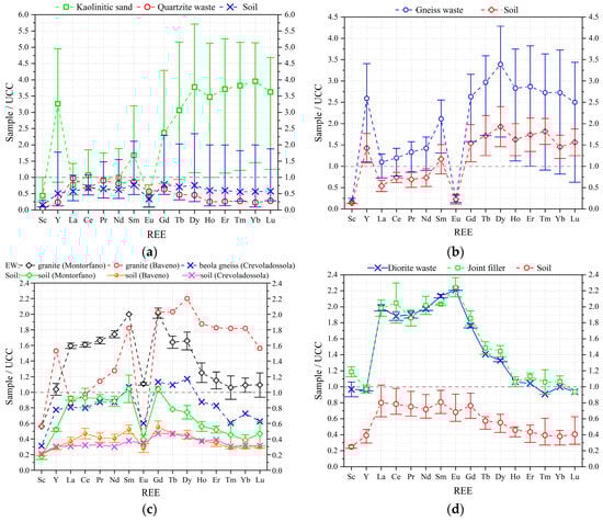 The CRM abundance in EWs, kaolinitic gneisses, and soils after UCC standardization is shown in Figure 5a–d.