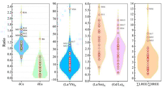Geochemical characteristic parameters of REEs in all samples. The diamond shapes represent individual samples.