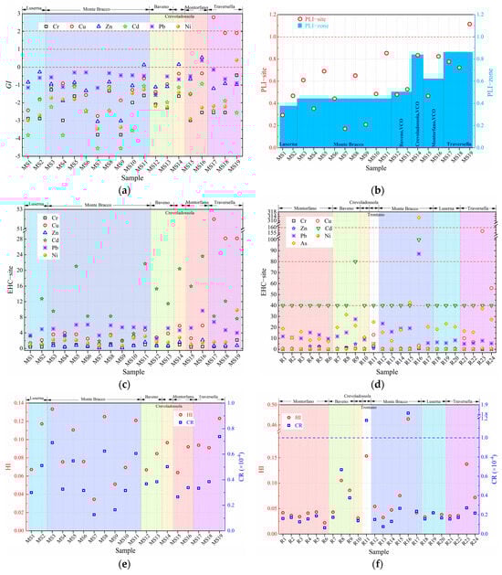 Potential environmental risks of soil and EW: (a) GI of soil; (b) PLI of soil; (c) EHC of soil; (d) EHC of EW; (e) human health risks of soil; (f) human health risks of EW.