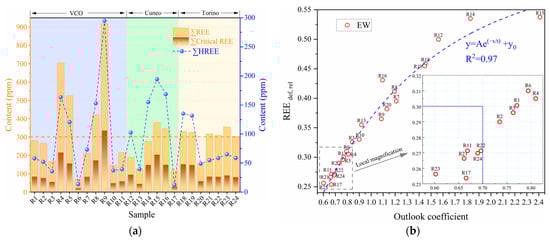 Compared to soil, EW and kaolinitic gneiss from Monte Bracco showed a significant enrichment of REE. For this reason, EW samples were selected to be the subject of REEs potential recovery tests. Figure 9a shows the total content of REE, the content of critical REE, and the contents of HREEs. Figure 9b depicts the REEdef,rel–Coutl graph; REEdef,rel is the proportion of critical REEs in total REE, and Coutl is the outlook coefficient. Details of its calculation method and meaning can be found in the reference [].