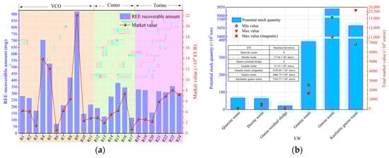 Figure 10b demonstrates that there is a certain positive correlation between the total stock quantity of EW with different lithologies and its potential total market value of REE, indicating that the huge EW stock quantity is very conducive to the industrial recovery of REE. In the Piedmont region, the total stock quantity of quartzite waste, diorite waste, and gneiss residual sludge is less than 100 × 103 tons. If all the REE reserves in it are recovered, the potential maximum market value that can be obtained is near 1000 × 104 EUR. Magnetic separation can increase the total revenue of REE recovery. For example, after the magnetic separation of granite waste, its total potential market value of REE increased by nearly 1000 × 104 EUR. The total accumulated amount of gneiss waste and kaolinitic gneiss waste is estimated to be about (3500–5000) ×103 tons in the period of 2005–2017; if all the REEs in EW are recovered, it is expected to have a potential market value of (7000–26,000) × 104 EUR, which is a very considerable income for a company.
