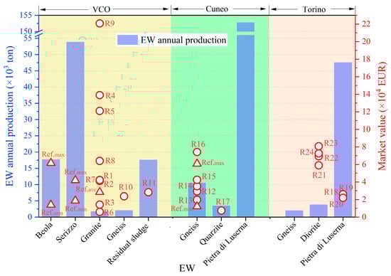 Samples with generally greater potential market value for REE recovery (Figure 11) are granite from Montorfano and Baveno (VCO area), diorite from Traversella (Turin Province), and brown kaolinitic gneiss from Monte Bracco (Cuneo Province). However, the annual production of these wastes results in a production that is insufficient to meet long-term sustainable REEs recovery on an industrial scale in a later stage (after EWs stock quantity is consumed). Although the annual production of EWs from Serizzo quarrying is significantly high, the maximum potential market value of its REEs recovery is less than 6.5 × 104 EUR. Similarly, with a high annual production, Pietra di Luserna has a low potential market value for REEs recovery.
