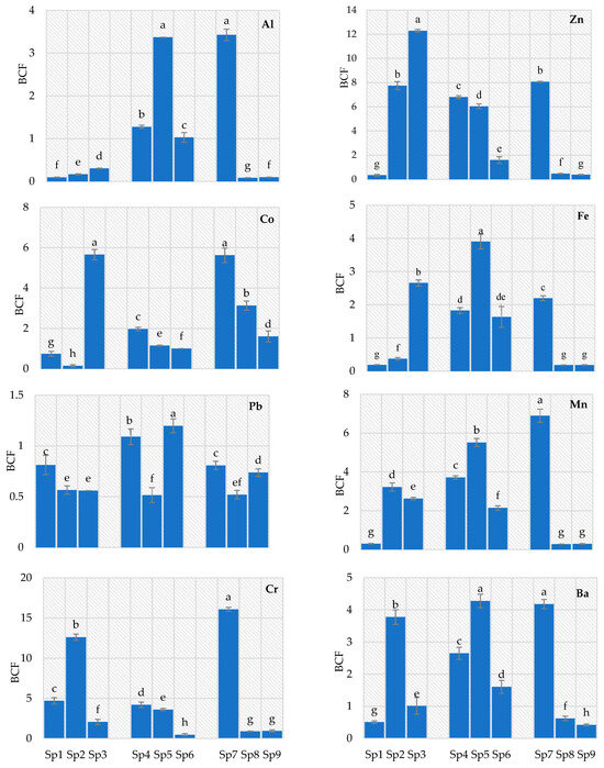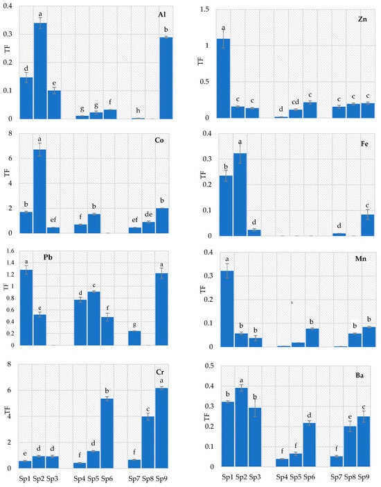 | Site | Plant Species | Al | Ni | Zn | Co | Fe | Pb | Mn | Cr | Ba |