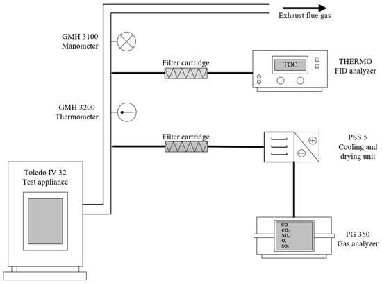 Figure 1 illustrates the layout of the test bench, including the construction arrangement and measurement devices. The test setup involved connecting the measurement section of the appliance to the flue socket using an uninsulated flue connector and flue adapter, with the steel flue connector measuring 2 m in length, 1 mm in thickness, and Ø 80 mm in diameter. Integration with the downstream measuring section, as shown in Figure 1, was facilitated through the flue adapter. This downstream measuring section encompassed the temperature, pressure, and gaseous inorganic pollutants and TOC measurements, featuring a diameter matching that of the flue socket. The temperature readings were captured using GMH 3200 series thermoelements, while the chimney draught was monitored with GMH 3100 series differential manometers by Greisinger GmbH, with the manufacturer’s recommended optimal pressure ranging between 5 and 15 Pa. Two exhaust gas samples were collected for quantitative analysis, with solid particles removed using PSP 4000-H gas sample probes by Testo AG equipped with sintered ceramics filters, heated to 200 °C for effective particle elimination. The conditioned gas sample was transported via heated pipes operating at 200 °C, with a THERMO FID analyzer by SK-Elektronik GmbH installed directly on the heated line for determining the gaseous organic compounds. The moisture content in the gas sample was eliminated using a PSS 5 cooling and drying unit from M&C Tech Group installed on a separate pipeline. Following gas conditioning, the PG 350 analyzer by HORIBA was employed for the determination of the O2, CO, CO2, SO2, NO, and NO2 in the exhaust gas. The analyte values were recorded at 30 s intervals within the internal memory of the measuring apparatus and later manually transferred to a computer via USB.