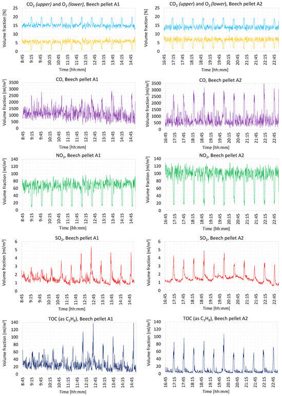 Throughout the test runs for both the A1 and A2 class beech pellets, the volume fractions of oxygen, carbon dioxide, carbon monoxide, sulfur dioxide, nitrogen oxides (expressed as NO2), and gaseous organic compounds (expressed as the total organic carbon) were monitored in the exhaust gas and reported as percentages for O2 and CO2 or in ml/m3 for NO2, SO2, CO and total organic carbon. Subsequently, the volume fractions were converted into mass concentrations under standard conditions [mg/m3] and then further transformed into the average mass flow of the analytes [g/h], average emission factor [g of analyte per kg of burnt fuel], and emission factor based on the energy content of the fuel [mg/MJ]. The emission factor based on the fuel energy content is particularly noteworthy as it quantifies the pollutants emitted per unit of energy generated during fuel combustion. This parameter enables a comparison of the emission levels and environmental impacts among different solid biofuels.