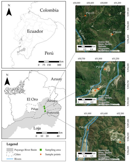 The study area encompasses the upper basin of the Puyango River, situated in southern Ecuador (Figure 1). This area is considered one of the country’s oldest and most important sites for artisanal and small-scale gold mining (ASGM) []. As an integral part of the Puyango–Tumbes Basin, this sector comprises key tributaries like the Calera, Amarillo, and Pindo Rivers, which feed into the Puyango River, eventually flowing into Peru [].