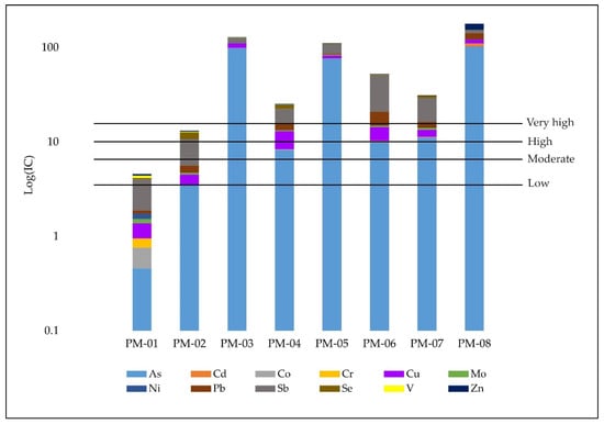 The results indicate potential environmental contamination in the studied area. Sample PM-01 presented a low index of contamination (IC = 4.56) followed by sample PM-02 with a high index of contamination (IC = 13.14), while the remaining samples exhibited a very high IC, ranging from 25.20 to 178.50 (Figure 2 and Figure S4 and Table S3). Specifically, six out of the eight analyzed tailing dams present an increased risk of environmental contamination. The elements that contributed the most to the IC were As and Sb (between 56 and 89%) for the samples PM-01 to PM-07, while in sample PM-08, the main contribution to the IC was As (57%), followed by Zn (14%) and Pb (12%) (Table S4).