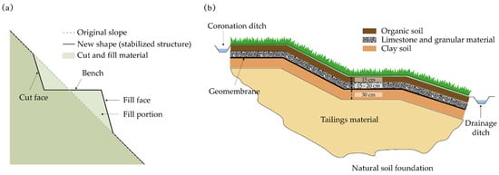 Rehabilitation involves restoring altered areas to achieve ecological stability, following a predefined plan to prevent further environmental damage. There are various alternatives for rehabilitation and remediation of disturbed lands, such as abandoned tailing deposits. Some of these alternatives use geosynthetic materials, vegetation, and soil encapsulation, as in Arranz-González et al. []. Figure 3 illustrates a remediation and rehabilitation proposal for the abandoned tailing areas highlighted in this study. The proposal consists of both physical and chemical stabilization. Physical stabilization aims to prevent potential slope failures. For the tailing dams requiring stabilization, a suggested approach involves benching through cut and fill techniques, as depicted in Figure 3a. Conducting a thorough slope stability analysis utilizing numerical and conventional methods during this phase is recommended. For chemical stabilization (Figure 3b), the aim is to avoid the generation of AMD by inhibiting the sulfide oxidation process. As the analyzed tailing deposits are considered potential long-term AMD sources, isolating the reactive materials from oxygen and water is necessary. Therefore, approximately 30 cm thick compacted clay soil should be placed on top of the contaminated material, covered by a high-density polypropylene geomembrane. This will allow a good seal and almost zero permeability. In addition, to facilitate drainage and prevent any pressure from filtered water, a thin layer (15 to 20 cm) of limestone and granular material, such as gravel, should be placed on top of the geomembrane. Finally, a 15 cm layer of vegetal or organic soil must be placed over this granular layer, facilitating vegetation growth.