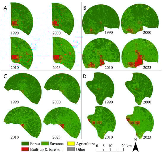 The expansion of built-up areas is accompanied by a decline in forest cover and an increase in savannas around the studied border cities. Urbanization often leads to direct deforestation for building, road infrastructures, and other urban installations. Trees are cut down to make space, reducing forest cover, as demonstrated by Cabala et al. [41] in the Lubumbashi plain and Bamba et al. [76] in the Kisangani region in the DR Congo. Additionally, urban growth can favor the exploitation of surrounding natural resources for fuel, wood, or other forest products. Yet, excessive exploitation leads to a significant decrease in forest cover [50,77]. Moreover, urban expansion can stimulate the conversion of forested lands into agricultural lands to compensate for the loss of agricultural lands encroached upon by urbanization to meet the growing food needs of the urban population, as observed in Freetown [74]. However, the felling of trees promotes sunlight penetration, a crucial element for the development of herbaceous vegetation dominating savannas [78], justifying the progression of savannas in the surrounding areas of the studied border cities. Furthermore, the fragile fertility of agricultural lands in these regions often leads to their rapid abandonment after 2 to 3 years of cultivation, favoring their colonization by herbaceous vegetation.