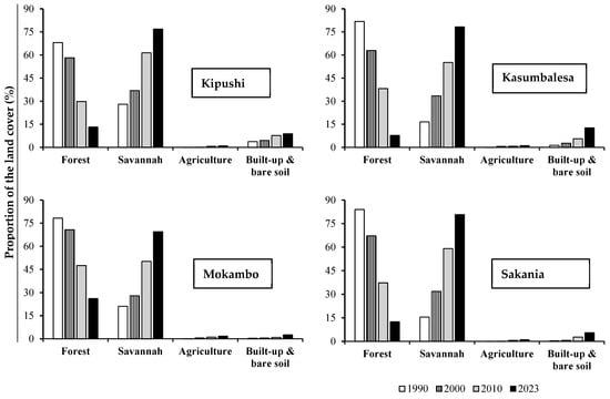 Landscape composition evolution in Congolese Cities (Kipushi, Kasumbalesa, Mokambo, and Sakania) bordering Zambia from 1990 to 2023. The total landscape proportion for each city does not sum to 100%, as other land cover classes were excluded from the analyses due to their relatively stable nature. The dynamics of landscape composition are evidenced by deforestation alongside the expansion of built-up and bare soil, agriculture, and savannas.