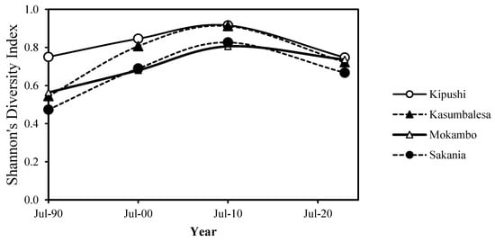 Landscape diversity dynamics of the cities of Kipushi, Kasumbalesa, Mokambo, and Sakania between July-1990 and July-2023. The studied cities are characterized by a transition marked by the shift from a less diversified landscape to a heterogeneous landscape over time.