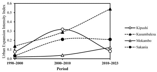 Variation in the urban expansion intensity index between 1990 and 2000, 2000 and 2010, and 2010 and 2023 within the landscapes of the border cities of Kipushi, Kasumbalesa, Mokambo, and Sakania. Urbanization is significantly more intense in Kasumbalesa, whereas relative stability was noted in Kipushi between 1990 and 2023.