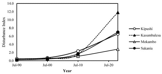 Additionally, during the period of 1990–2023, a significant increase in the disturbance index was observed within the landscapes of the studied border cities (Figure 6). In Kipushi, this index was multiplied by 14, increasing from 0.5 in 1990 to 6.5 in 2023. In Kasumbalesa, an even more pronounced increase was noted, with a multiplication factor of 53, raising the index from 0.2 in 1990 to 11.8 in 2023. For Mokambo, the index was multiplied by 10, increasing from 0.3 in 1990 to 2.8 in 2023. Lastly, in Sakania, the index was multiplied by 37, reaching 7 in 2023 compared to an initial value of 0.2 in 1990 (Figure 6). These increases reflect a significant intensification of human activity in these regions over this 33-year period.