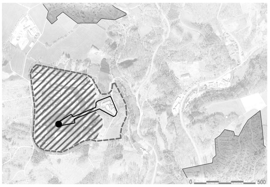 :metabolon in Lindlar, where research–educational–recreational areas (outline) with a viewpoint (black dot) surrounded by waste management areas (hatched area) adjacent to settlements (grey outlined areas) were accepted by the community (Szewczyk-Świątek A., 2024).