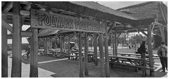 An essential investment in Przecieszyn realised as part of the “Renewal and Development of Villages” program is Folwark Przecieszyn, whose form and building materials (wood and thatch) evoke popular imagery of folk architecture. The name of the place is an example of “mazurzenie” (a folk pronunciation phenomenon replacing the “sz” sound in the name of the locality with “s”) (we obtained photo permission from Żak Z., 2024).