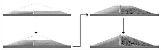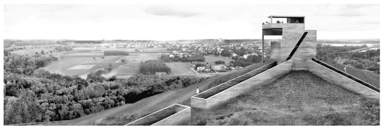 Initial design proposals for this area disguised the construction material, concealing it behind a greening project and a vision of numerous sports and recreational attractions on the site. However, this idea (costly and challenging to implement and maintain) was quickly abandoned in favour of a project that revealed the building material and transformation stages. It was assumed that “adits”, corridors incorporated into retaining walls leading into the interior of the “mountain”, would be incorporated into the technical infrastructure facility, implemented concurrently with the dumping of subsequent levels of the structure—allowing public access to the area. The central, expanding staircase, surpassing the summit of the mass at each stage, was designed to create a viewpoint (Figure 4). Due to natural ecological succession, the facility’s lower levels would become green faster than the higher parts, highlighting the technological process and the action of natural forces. By linking the form of the facility with the pace of filling the mass with waste aggregates, the coal market situation (influencing the number of surplus aggregates) would be reflected in the material form. Combining technical needs with the need to shape the place’s identity, the facility’s form was planned to emphasise the visibility of the building material of the mass and its compositional and visual connection with neighbouring industrial objects and industrial heritage (Figure 5 and Figure 6). The facility was designed by outlining the target form at the initial stage. Still, the construction method allows for flexibility in the erection process (without limiting the company or the possibilities of public use). The landscape object was planned to be constructed and gradually opened to the public in stages (the final relative height was planned as c. 150 m). The speed at which these stages would be realised and when the entirety would be completed was not specified. The aim was to ensure the attractiveness of the undertaking for both social and economic parties and to promote industrial activity as part of the local culture. The landscape form can be understood as a mediator that helps facilitate slowing down the process of transformation—in favour of the mining enterprise, as well as the community (by offering a vision of open public space created by the mining enterprise that the community can use as part of strategic piggybacking).