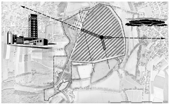 The programmatic-spatial concept covered the entire area of the Brzeszcze-East HCM. It included adaptations of surface mine facilities for service, commercial, and residential functions. Due to the topic discussed in this article, particular attention is paid to the proposal for using the part of the land not occupied by historical buildings, including undeveloped areas. Buffer storage—formerly considered non-buildable areas to avoid blocking the functioning of the mining plant, its transportation infrastructure, warehousing, reloading areas, and waste heaps—also represents essential traces of the activity there. Leaving undeveloped areas of such significant parameters resulted in sacrificing them for the possibility of industrial activity, but their image is not characteristic of the residents. Popular conviction is that there is nothing there (which was severally repeated in interviews). Currently degraded, uninhabited, unincorporated into the urban structure, housing a landfill and municipal waste sorting facility, this area lacks characteristic landmarks yet is changing through spontaneous natural succession. In the transformation project, these waste-filled areas, hidden behind heritage structures made of red, unpainted brick, are planned to be publicly accessible before they are fully restored before the presence of waste is hidden under overgrown greenery. Minimal architectural interventions were intended to define the available spaces, those not planned to be fully repaired yet (where investment from the renewable energy production, recovery, processing, and waste storage industry is desired). In other words, a circular landscape was planned (Figure 7), and the most characteristic elements in the environment’s appearance are waste deposition and processing sites, industry-abandoned structures adapted with the preservation of entropy traces, and phytoremediation plantings, as well as facilities for renewable energy production.
