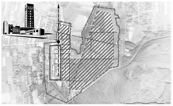 Emphasising the visibility of industrial heritage, waste, and active industrial facilities has inspired the creation of an urban grid (dashed lines) defining the appearance of the environment responding to the Green Deal policy guidelines—a circular landscape at the site of the inactive Brzeszcze-East HCM. Beyond the belt delineated by historical buildings (rectangular outline) and the new methane cogeneration installation (black dot), circular industrial areas (processing, recovery, and waste storage, renewable energy production—hatched area) were designed (Szewczyk-Świątek A., 2024).