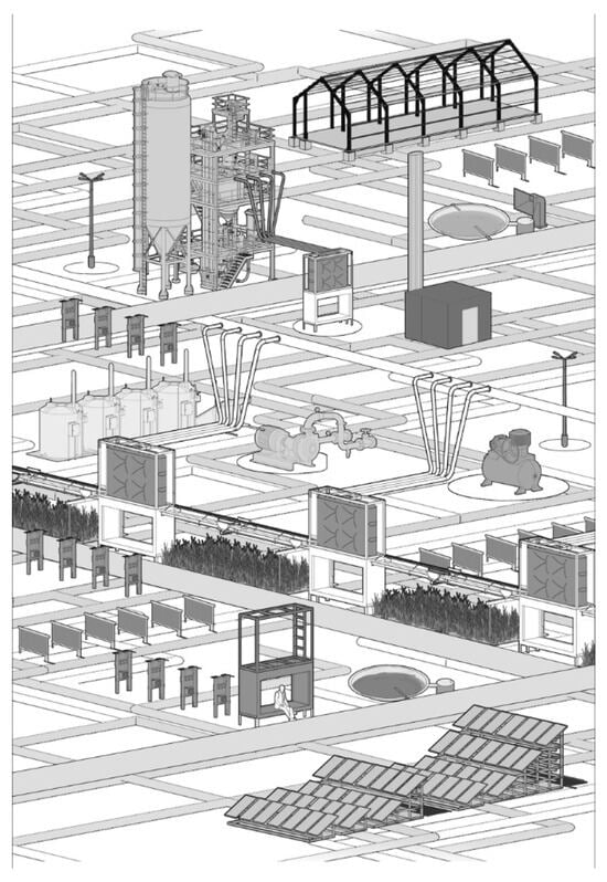 Similarly to the project for the ”G” Flooded Land in Przecieszyn, in Brzeszcze-East HCM, industrial facilities (both old and new industry) in the vicinity were highlighted by the urban grid as necessary for the area’s identity. During the work, a “toolbox” (Figure 8) with elements of installations (pipelines, intakes, rainwater tanks, boilers, biofuel silos, pumps, compressors, transformers, capacitors, collectors, etc.) was created, which could be used to delineate the designed urban grid in the terrain and ensure the creation of public spaces adjacent to circular industrial areas, allowing access to them. These were the only elements the design team considered feasible for implementation at the preliminary stage of transformation, along with those whose construction is possible with public funds. Furthermore, their implementation does not require the municipality to agree with a specific investor or define the eventual land use. The city considered these arguments sufficient to accept this course of action. When designing the “toolbox”, efforts were made to give the installation elements an attractive appearance of forms, as they could promote public and recreational use of the terrain—pipelines were assigned a colour code, rainwater tanks were connected to resting places, photovoltaic panels can serve as rain covers, etc. Attention was paid to the solution’s aesthetics, and efforts were made to combine landscape design with circular economy signs.