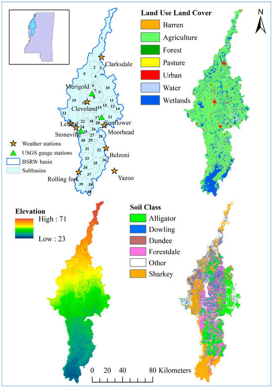 The BSRW is in the Mississippi Alluvial Plain within the Mississippi Delta. The model-estimated drainage area of the watershed is 8326 km2 and lies within 11 counties in northwestern Mississippi. The elevation of the watershed ranges from 23 to 71 m above mean sea level. The BSRW is an agriculturally dominated watershed with soybean, corn, rice, and cotton as major crop types according to land cover classification provided by the National Agricultural Statistics Service [36] (Figure 1). The major types of soil in the area are Alligator, Dowling, Dundee, Forestdale, and Sharkey, according to soil data provided by the National Resources Conservation Service [37], all of which have high silt and clay percentages contributing to higher surface runoff and low permeability. Due to such soil characteristics, only a small amount of surface water infiltrates through the soil profile into the Mississippi River Valley Alluvial Aquifer (MRVAA) [38]. Moreover, the majority of water utilized for agriculture and industry in the Mississippi Delta comes from the MRVAA through pumping, causing groundwater depletion [38].