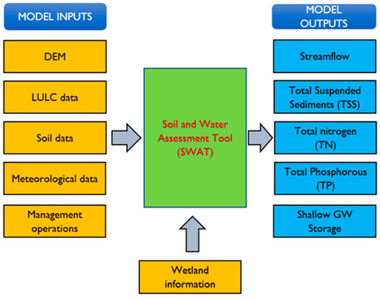 SWAT is a process-based semi-distributed watershed modeling tool that requires a variety of spatial and temporal data on the physical characteristics of a watershed, such as surface elevation, land use, soil type, climate data, and management data, and predicts the impacts of land-use change, climate change, and management decisions on surface and groundwater [27,39]. SWAT delineates watersheds into subbasins which are further divided into smaller areas based on unique land use, soil, and slope attributes known as hydrologic response units (HRUs). Each HRU can be modified by the user to incorporate certain management decisions, as well as parameters that control the movement of surface water, groundwater, and pollutants [40]. The hydrological cycle simulated by the modeling tool is based on the water balance calculated at the HRU level and is controlled by climatic factors such as precipitation, temperature, solar radiation, relative humidity, and wind speed [40]. In this study, the Digital Elevation Model (DEM), soil data, and LULC data, each with a spatial resolution of 30 m, were provided to the model along with weather data, management operations, and wetland parameters to determine surface runoff, shallow groundwater storage, and water quality outputs (Figure 2).