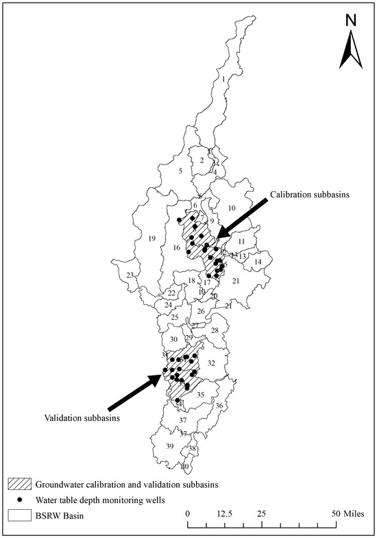 Watershed map showing groundwater monitoring wells, model calibration, and validation subbasins.