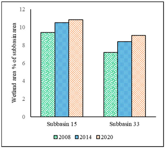 Percentage of wetlands in watershed sub-basins 15 and 33 in the years 2008, 2014, and 2020.