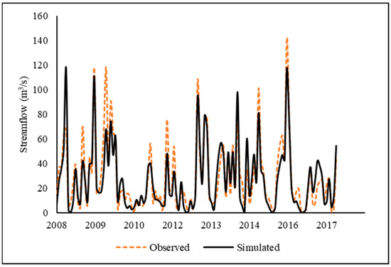 The model was calibrated and validated for monthly streamflow with reasonable accuracies, where R2 ranged from 0.60 to 0.87, and NSE ranged from 0.60 to 0.84. Table 4 shows the summary of statistics obtained during the calibration and validation of streamflow at three USGS gauge stations. The time series of simulated and measured streamflow data during calibration and validation at the Sunflower gauge station are presented in Figure 5.