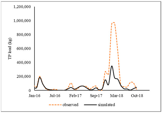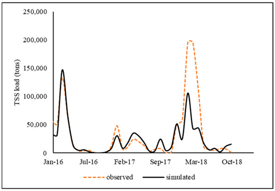 The model was calibrated and validated for monthly TSS with acceptable accuracies, where R2 ranged from 0.68 to 0.94, and NSE ranged from 0.48 to 0.85. Table 5 shows the summary of statistics obtained during the calibration and validation of TSS at three USGS gauge stations. The time series of simulated and observed TSS data during calibration and validation at the Sunflower gauge station are presented in Figure 6. Despite the reasonable statistics, there was a difference between observed and simulated TSS loads in February 2018 due to SWAT’s limitation in capturing peak flow and floodplain erosion [66,67]. Additionally, the TSS loads are highly affected by factors such as tillage, especially in agricultural watersheds like BSRW. The rate, time, and space of such operations are variable, thus creating uncertainty in capturing peak TSS loads.