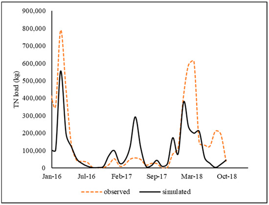 Among all the selected parameters, FRT_SURFACE and NPERCO were the most sensitive parameters, with p-values less than 0.05. These parameters control the fertilizer application to the soil surface, and nitrate removal in runoff from the surface, which directly influence the total nitrogen. The model was calibrated and validated for monthly TN with acceptable accuracies, where R2 ranged from 0.30 to 0.90, and NSE ranged from 0.04 to 0.84. Table 7 summarizes the statistics obtained during the calibration and validation of TN at three USGS gauge stations. The time series of observed and simulated TN loads during calibration and validation at the Sunflower gauge station is shown in Figure 8.