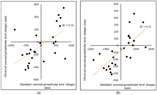 Simulated vs. observed seasonal groundwater level changes from 2008 to 2020 during model: (a) calibration, and (b) validation.