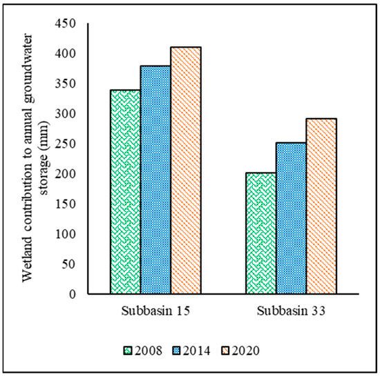 As a result of an increase in areas, the contribution to shallow groundwater storage by wetlands increased. In subbasin 15, the contribution to the shallow aquifer by wetlands was 40 mm higher in 2014 than in 2008. Similarly, the contribution to the shallow aquifer in 2020 was 31 mm higher than in 2014. Likewise, in subbasin 33, the contribution to the shallow aquifer in 2014 was 50 mm higher than in 2008, and 40 mm higher in 2020 than in 2014. Figure 10 shows the increase in annual groundwater storage in both sub-basins.
