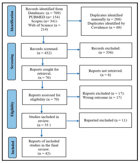 The search across PubMed, Scopus, and Web of Science databases identified 709 articles, filtered by title, abstract, publication date (2014–2024), and English language. After removing 208 duplicate articles manually using Endnote and 69 duplicates automatically with Covidence, 432 records were assessed for eligibility. Following a comprehensive peer evaluation of the search strategy, the titles and abstracts of these records were screened, leading to the exclusion of 356 articles. Subsequently, 76 articles underwent full-text review, though 6 articles were not retrievable, leaving 70 articles for full-text screening. After reviewing these articles, 17 were excluded due to having outcomes that did not align with the study’s criteria. Thus, out of the initial 53 studies, 42 were incorporated into this review, while 11 were excluded due to insufficient data. The details of the included studies and the extracted data are presented in Table A1 in the Appendix A.