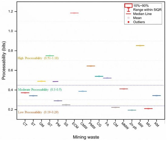 Processability combines the metrics of grade and entropy to evaluate the feasibility of processing mining waste. The processability formula (Equation (3)) incorporates both the grade and entropy to determine how practical it is to recover valuable materials from waste. This calculation helps in identifying which types of mining waste are more suitable for recycling based on their processability value [45].