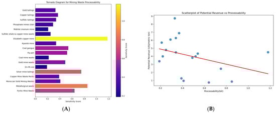 (A) The tornado diagram showcases the sensitivity analysis of waste processability. Each bar’s length shows the percentile deviation from the base condition, with larger bars indicating greater sensitivity. Variables are ranked from highest to lowest impact, highlighting which factors should be prioritized for optimization. (B) Scatter plot of processability and mining waste potential revenue from correlation model.